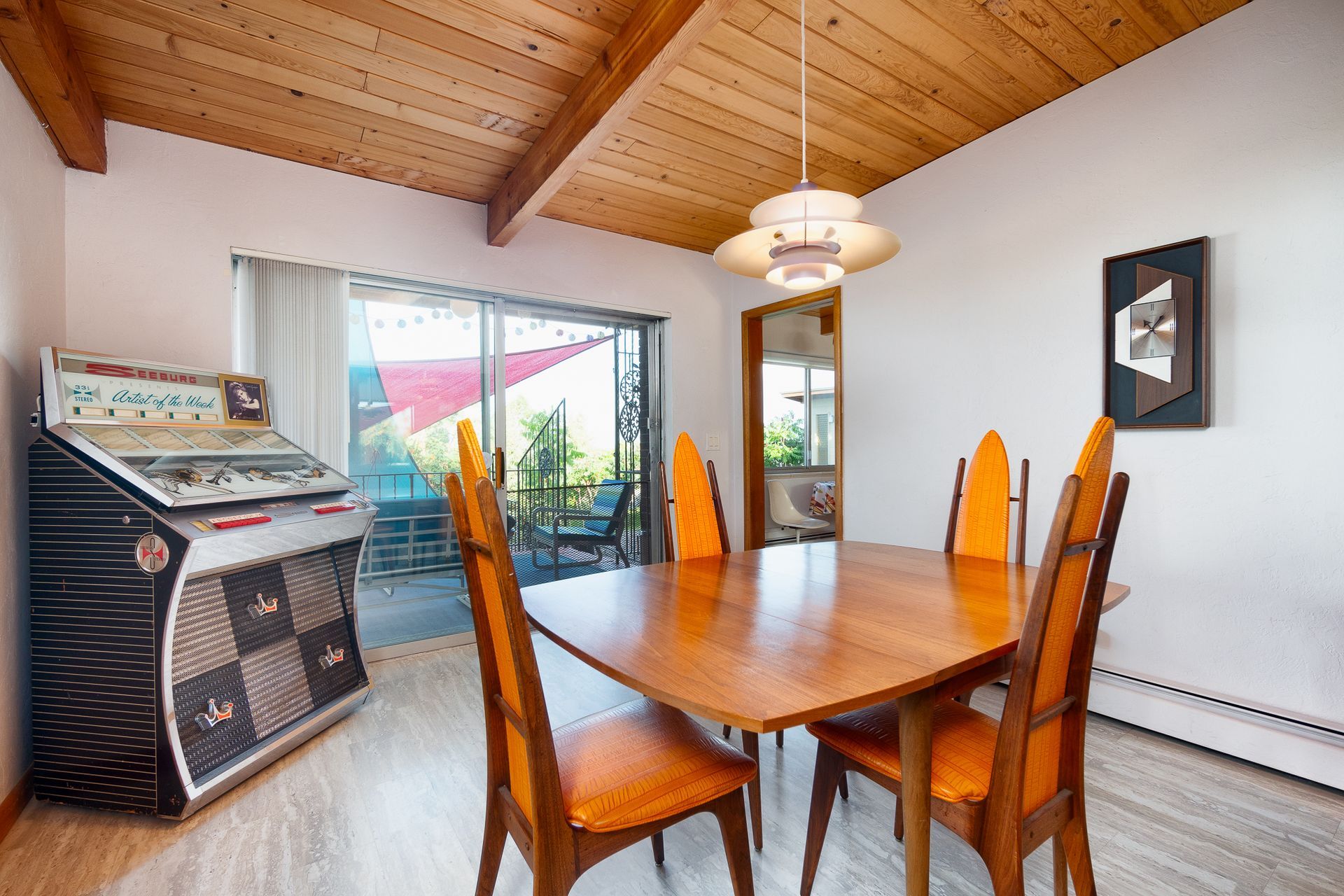 A stroll into the south wing of the home reveals a spacious dining room featuring a delightful built-in buffet for your colorful mid-century dishware and a sliding glass door to the yard.