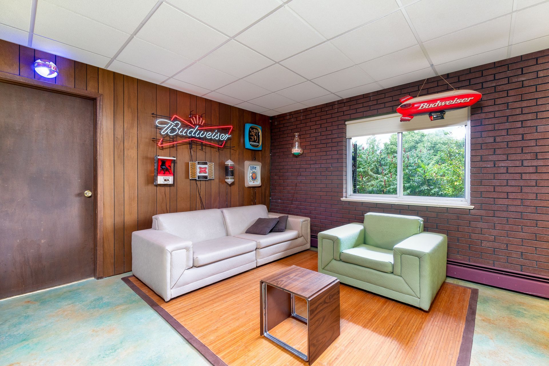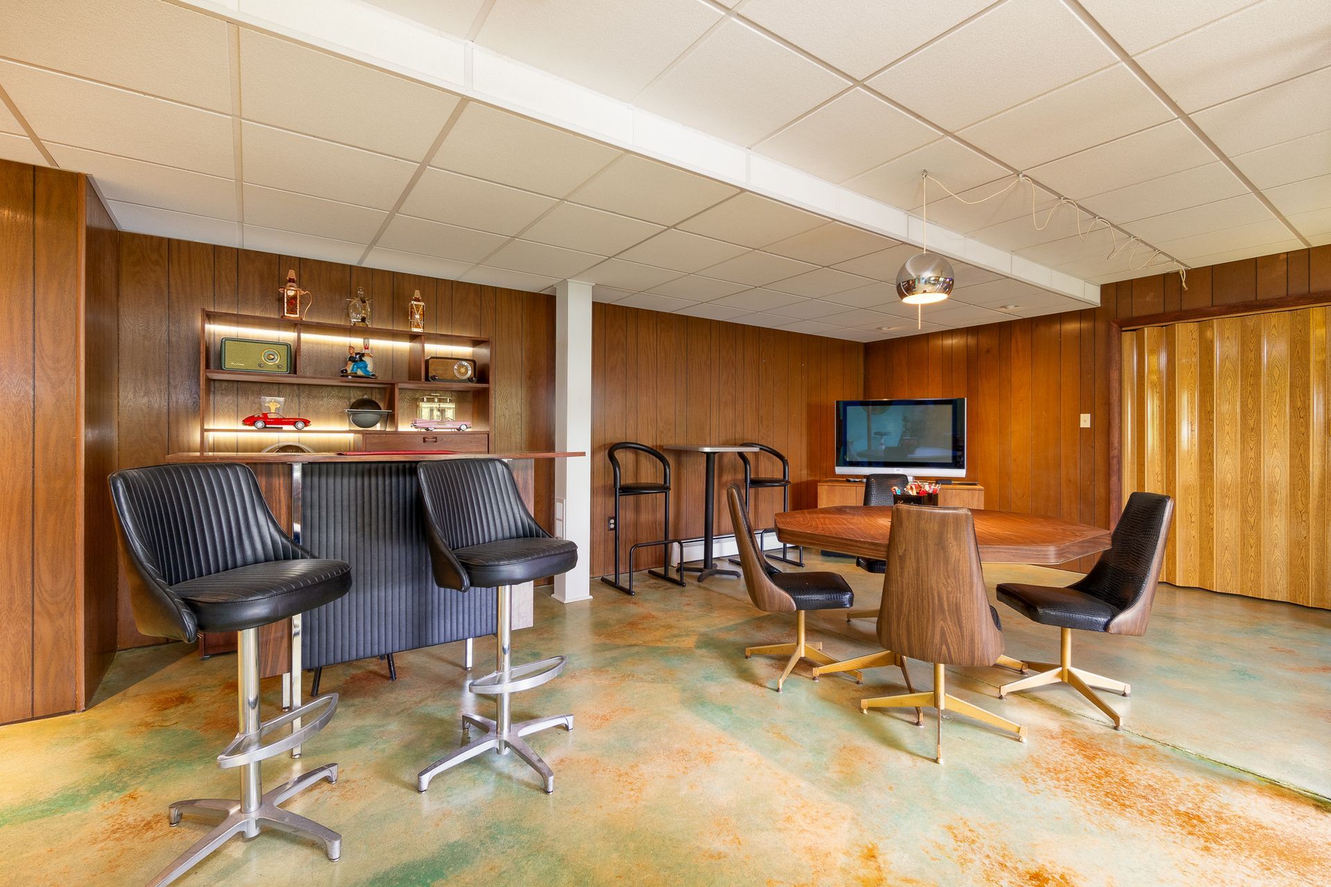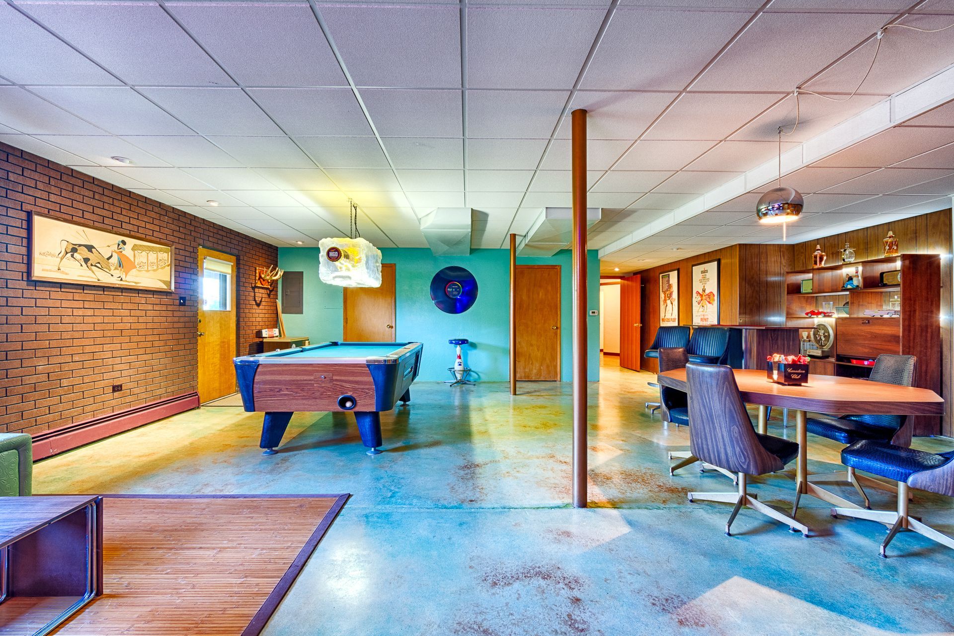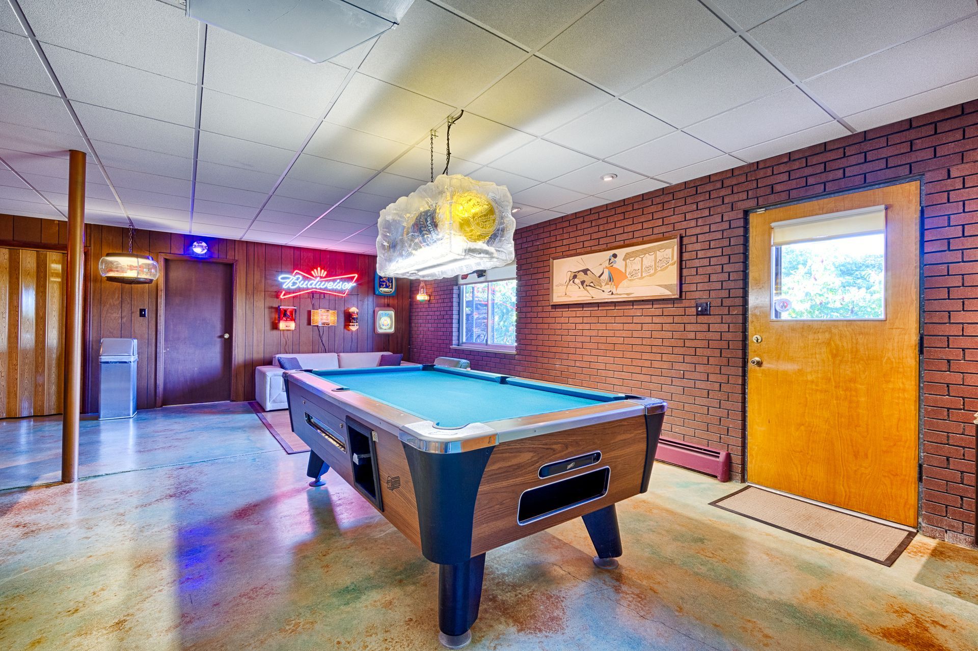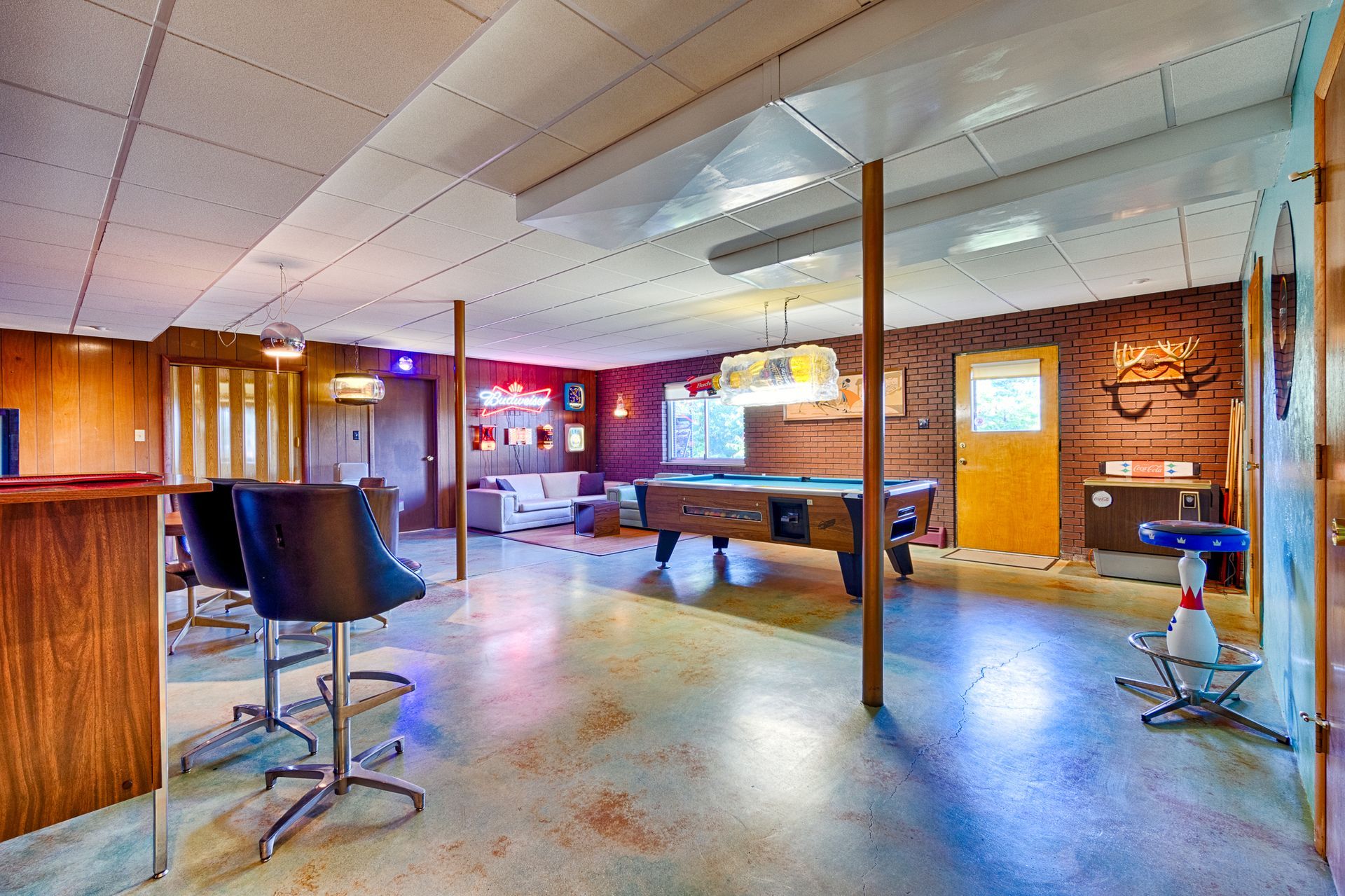 The voluminous game room boasts tall ceilings and space for whatever you can imagine – arcade, home theater, let your imagination run wild! Stained & polished concrete floors subtly let you know the block and masonry construction supporting the home is solid as a rock and has withstood the test of time.